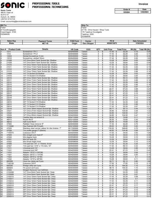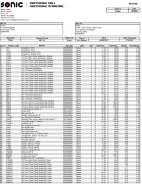 New Sonic Tools in Manufacturer's Boxes. Please see photos of Commercial Invoice 4090522881 for details. HIT #2522449. Asset Located at 13691 Danielson Street Unit A, Poway, CA 92064.