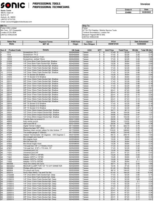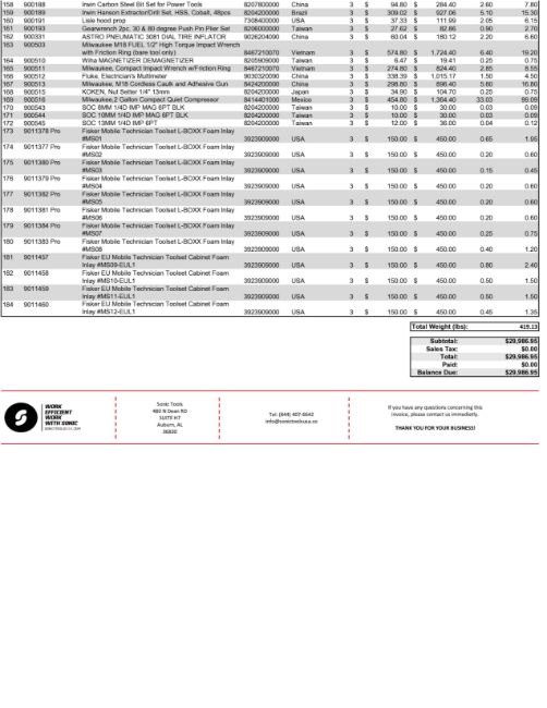New Sonic Tools in Manufacturer's Boxes. Please see photos of Commercial Invoice 4090522914 for details. HIT #2522446. Asset Located at 13691 Danielson Street Unit A, Poway, CA 92064.