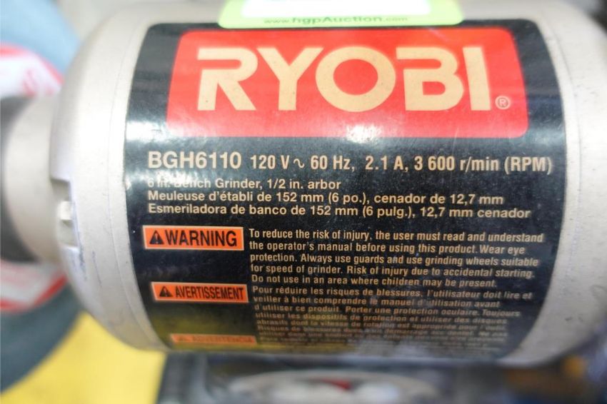 Ryobi BGH6110 6" Bench Grinder 120 v, 2.1 AMPS, 60 Hz. ***AUCTIONEER NOTICE*** Removal Deadline is December 20th - No Exceptions. HIT# 2483085. Asset Located at 400 Parkland Dr., Charlotte, MI 48813.
