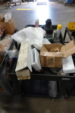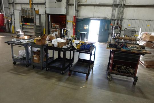 Lot (4) Rolling Shop Cart and (1) Metal Custom Built Shop Cart w/ Contents Consisting of: Thermolator Connectors, O Rings, Nuts, Bolts, Reams, Hose Connectors, Taps, and Wire (Please Inspect). ***AUCTIONEER NOTICE*** Removal Deadline is December 20th - No Exceptions. HIT# 2483100. Asset Located at 400 Parkland Dr., Charlotte, MI 48813.