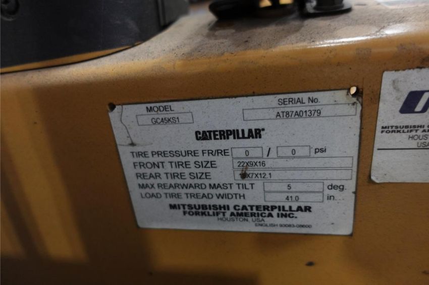 Caterpillar GC45KS1 9100 lb. Capacity Propane Forklift. ***AUCTIONEER NOTICE*** Removal Deadline is December 20th - No Exceptions. SN# AT87A01379. HIT# 2483096. Asset Located at 400 Parkland Dr., Charlotte, MI 48813.