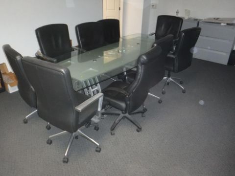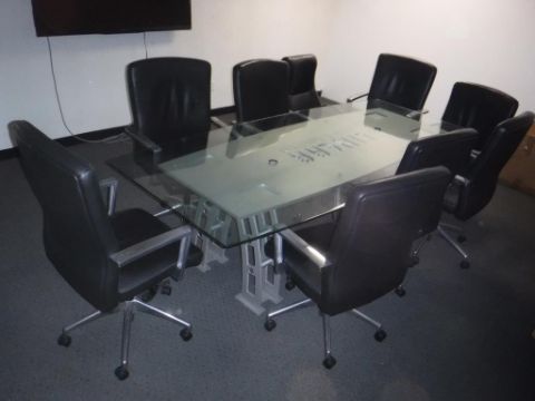 Lot (1) 111" x 48" Glass Top Conference Table (w/ Linear Engravement), (9) 5-Caster Office Chairs, (2) 20" x 38" x 42" 3-Drawer Filing Cabinets, and (1) 70" Sharp Aquos Television. ***AUCTIONEER NOTICE*** Removal Deadline is December 20th - No Exceptions. Hit# 2516005 2nd floor office area on left. Asset Located at 12163 Globe Street Livonia, MI 48150.