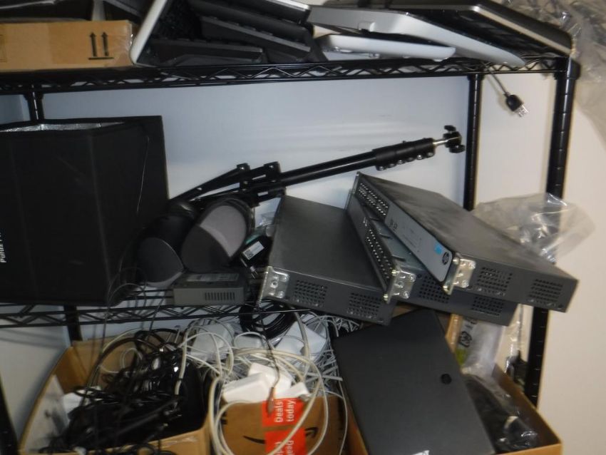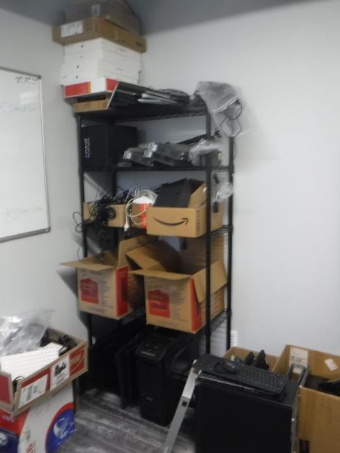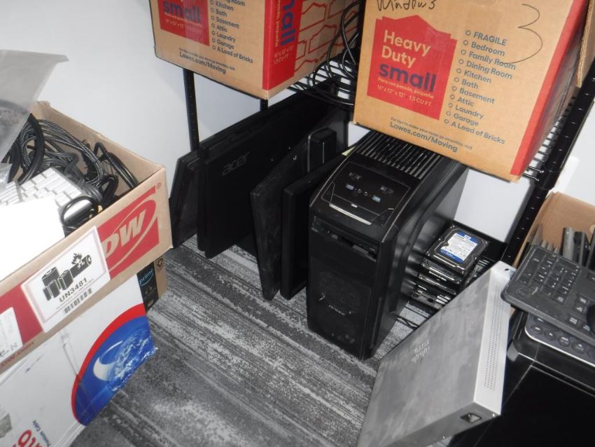 Lot (2) 5-Tier Wire Racks, (1) L-Shaped Office Desk, and (1) 5-Caster Office Chair w/ Assorted IT Equipment Contents Consisting of: Lenovo, LG, Acer, Antec, Microsoft, and Dell Brand Laptops, Monitors, and Desktop Towers (Please Inspect). ***AUCTIONEER NOTICE*** Removal Deadline is December 20th - No Exceptions. Hit# 2515995 1st Floor Hallway past breakroom. Asset Located at 12163 Globe Street Livonia, MI 48150.