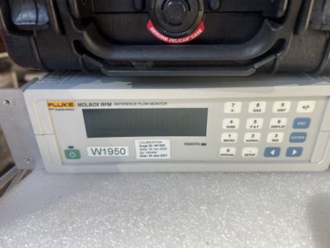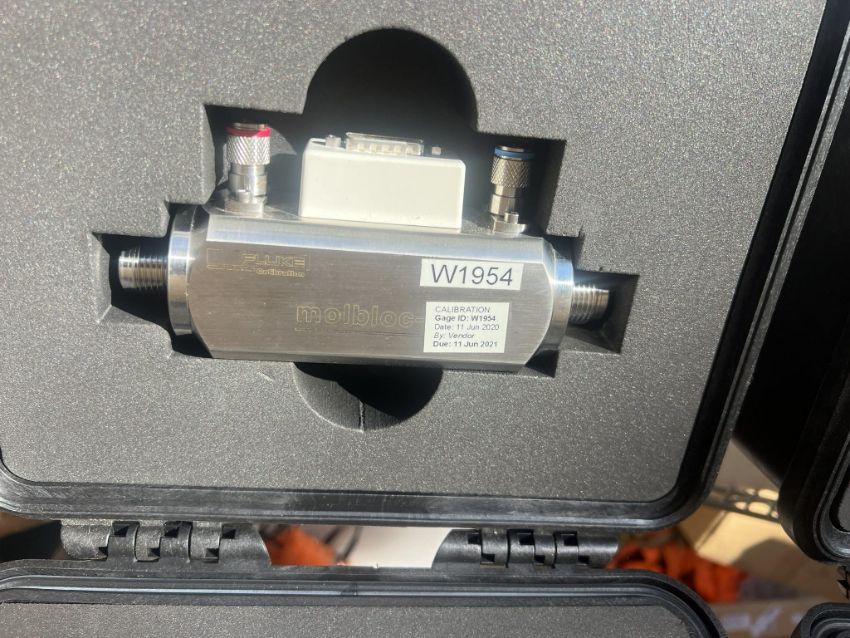 Laminar Flow System to include (1) Fluke 1E5-VCR-V-Q molbloc-L Laminar Mass Flow Element and (1) Fluke molbox RFM Flow Monitor. Case Included. Asset Located at 26545 Danti Court, Hayward, CA 94545.