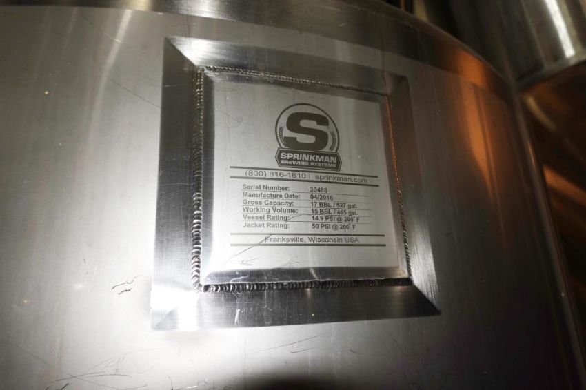 Sprinkman Brewing Systems Stainless Steel 17 BBL Yeast Prop Tank, Vessel Rating 14.9 psi @ 200F, Jacket Rating 50 psi @ 200F. Date of Manufacture 4-2016. SN# 30488. HIT# 2481934. Loc: Brewery 3725. Asset Located at 3725 Greenwood St., San Diego, CA 92110.
