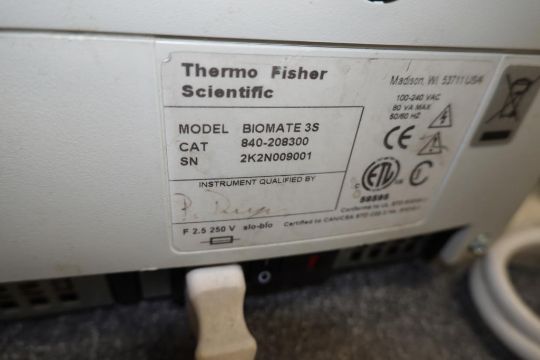 Thermo Scientific Biomate 3S UV-Visible Spectrophotometer System. SN# 2K2N009001. HIT# 2481908. Loc: Lab. Asset Located at 3725 Greenwood St., San Diego, CA 92110.