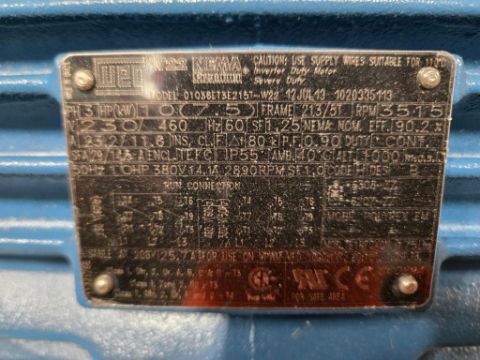 WEG 01036ET3E215T-W22 38760A 10hp Electric Inverter Duty Motor, 3 Phase, 230/460V, 60Hz, 3515rpm w/ Steel Platform. ***AUCTIONEER NOTICE*** Removal Deadline is December 20th - No Exceptions. HIT# 2452780. Row 1-G-2-C. Asset Located at 74 New York Ave., Framingham, MA 01701.