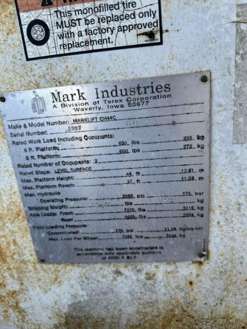 Mark Industries CH44C LP Powered, 650 lb. Rated Work Load, 2 Occupant, Man Lift. S/n#1997. HIT# 2506367. Loc: Outside. Asset Located at 545 Old Elbert Rd., Royston, GA 30662.