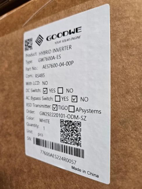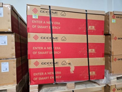 GoodWe GW7600A-ES Lot Includes (6) 7600W Split Phase PV Hybrid Inverters w/ DC Switch & RSD Transmitter, Part#AES7600-04-00P. HIT# 2544824. Bldg. 3 Front. Asset Located at 2366 Alvarado St., San Leandro, CA 94577.