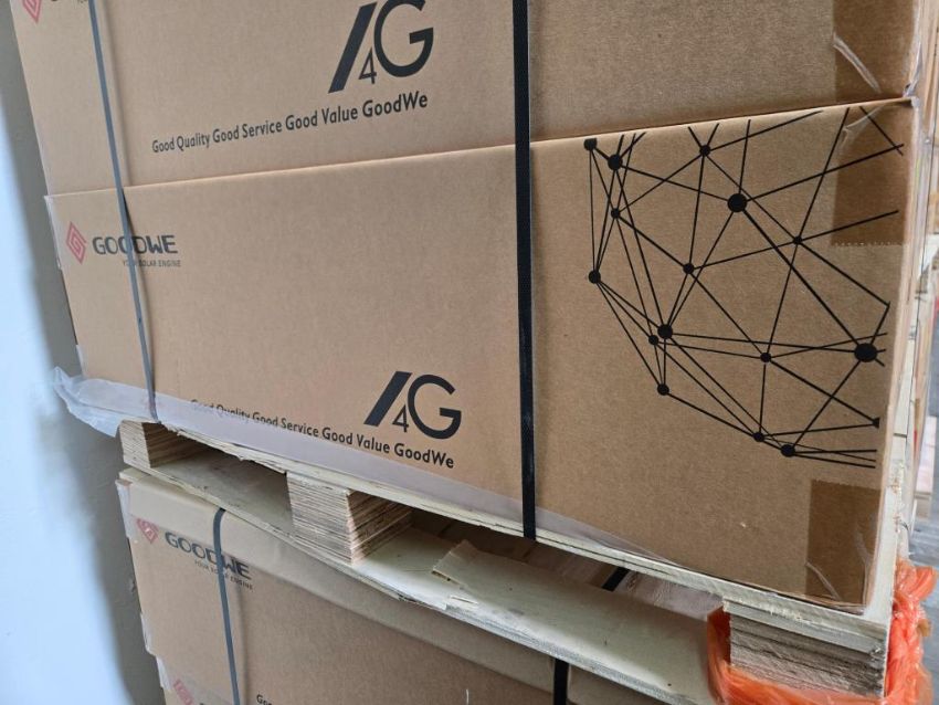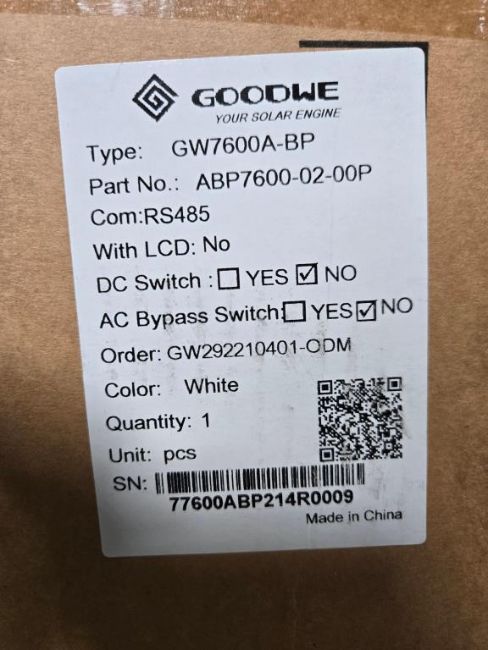 GoodWe GW7600A-BP 7600W Split Phase AC Coupled PV Inverter, Part#ABP7600-02-00P. HIT# 2544813. Bldg. 3 Front. Asset Located at 2366 Alvarado St., San Leandro, CA 94577.