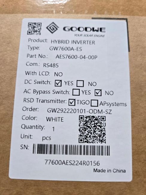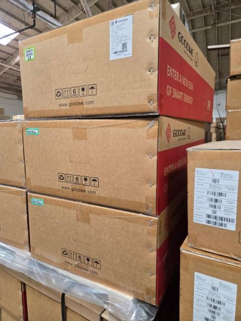 GoodWe GW7600A-ES Lot Includes (3) 7600W Split Phase PV Hybrid Inverters w/ DC Switch & RSD Transmitter, Part#AES7600-04-00P. HIT# 2544916. Bldg. 3 Front Back Wall. Asset Located at 2366 Alvarado St., San Leandro, CA 94577.
