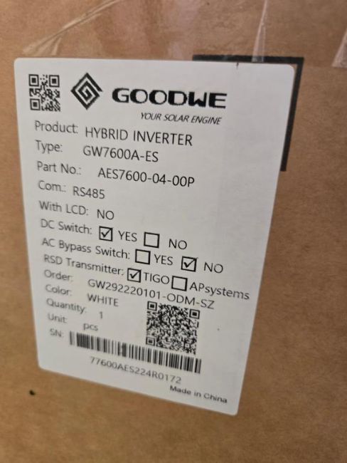 GoodWe GW7600A-ES Lot includes (2) 7600W Split Phase PV Hybrid Inverter w/ DC Switch & RSD Transmitter, Part#AES7600-04-00P. HIT# 2544935 & 2544936. Bldg. 3 Front Back Wall. Asset Located at 2366 Alvarado St, San Leandro, CA 94577.