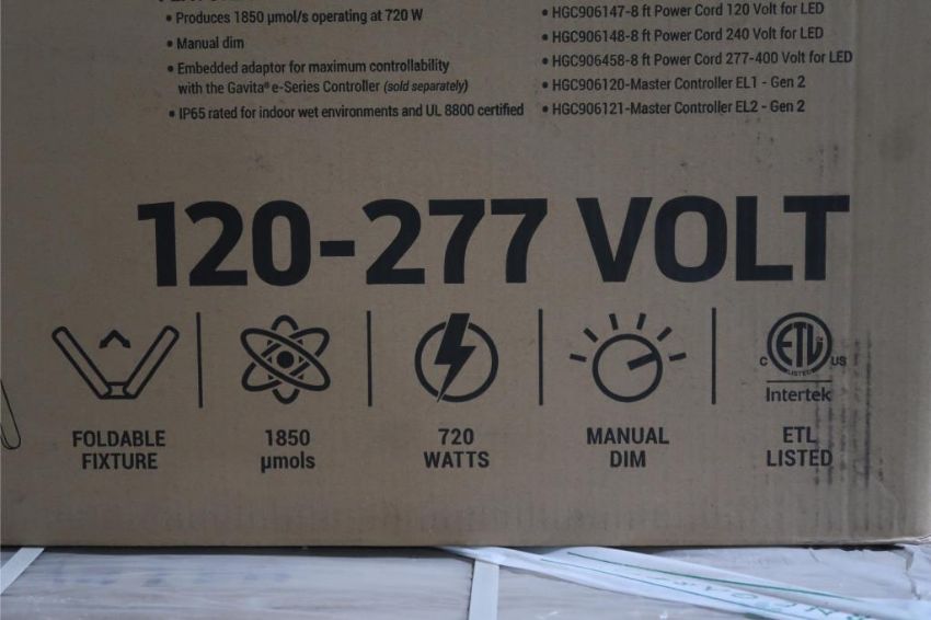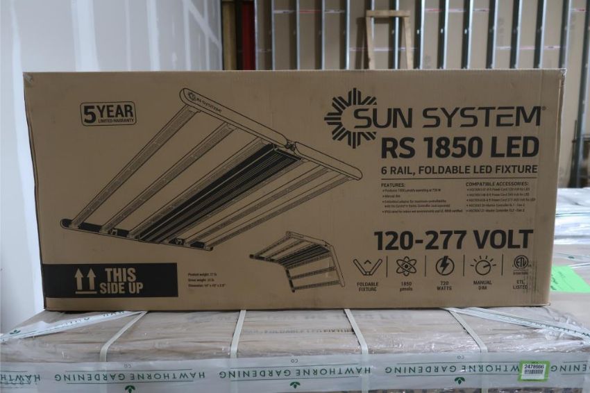 Hawthorn Gardening Sun System RS 1850 LED Lot Includes (10) 6-Rail Foldable LED Fixtures, 1850 µmol/s at 720 Watts, Manual Dim, 120-277V, IP65 Rated for Indoor Wet Environments, UL 8800 Certified, (In Manufacturer's Packaging, Detail Photos Representative Only). HIT# 2478981. Asset Located at 6600 New Venture Gear Dr. Suite P19, Syracuse, NY 13057.
