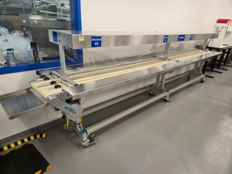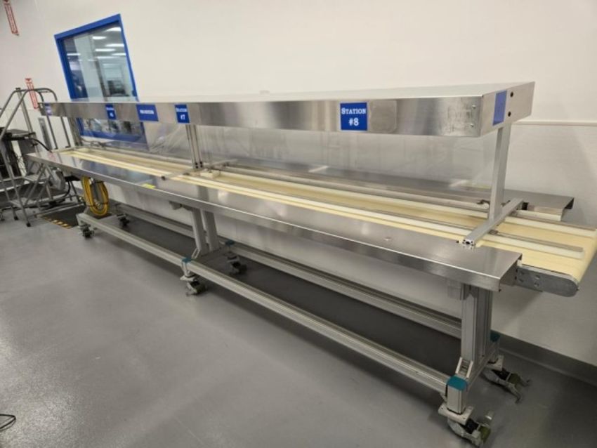 Montech Portable Manual Inspection Conveyor System, 18"x16' Belt Conveyor, SS w/ Lower Aluminum Frame, Upper Lighting, Casters, SS Dispensing Tray, ABM Type G80F/4D63B-4 Drive Motor 0.18KW/230-400V/50Hz . HIT# 2511431. Asset Located at 1945 Craig Rd., St. Louis, MO 63146.