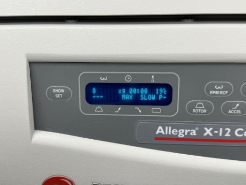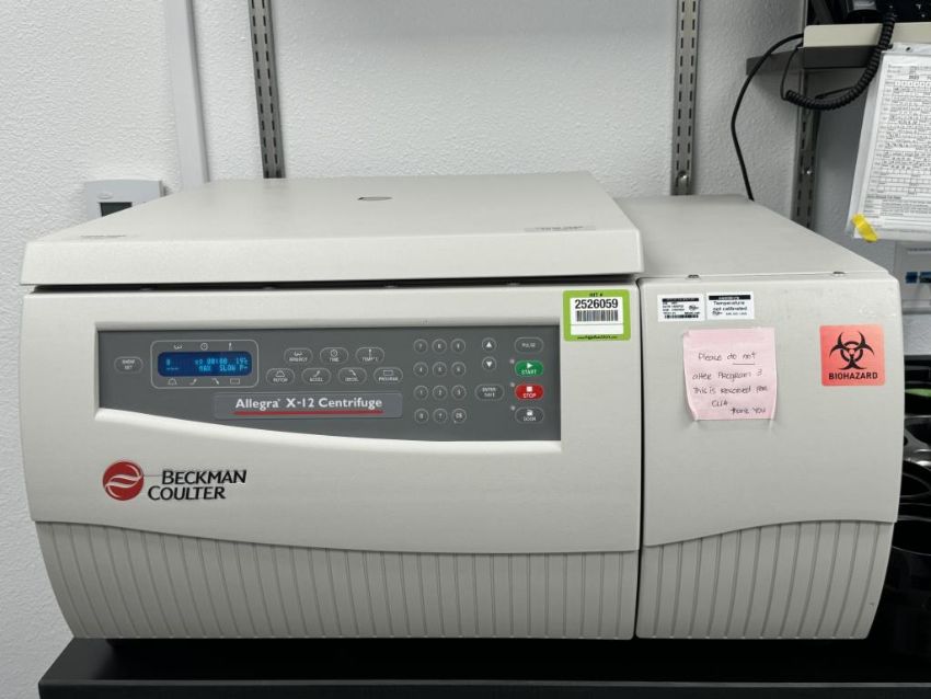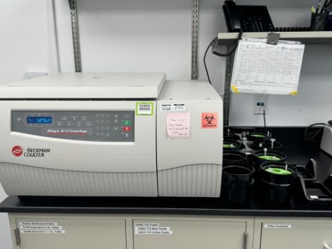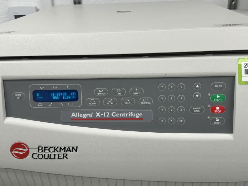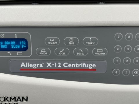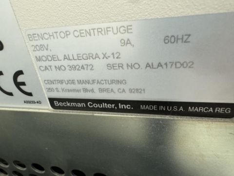 Beckman Coulter Allegra X-12 Benchtop Centrifuge includes (2) Swinging Bucket Rotors. (1) SX4750A, (1) SX4750 and spare buckets. S/N ALA17D02. HIT # 2526059. Cell Culture 128.Asset Located at 9955 Mesa Rim Road, San Diego, CA 92121.