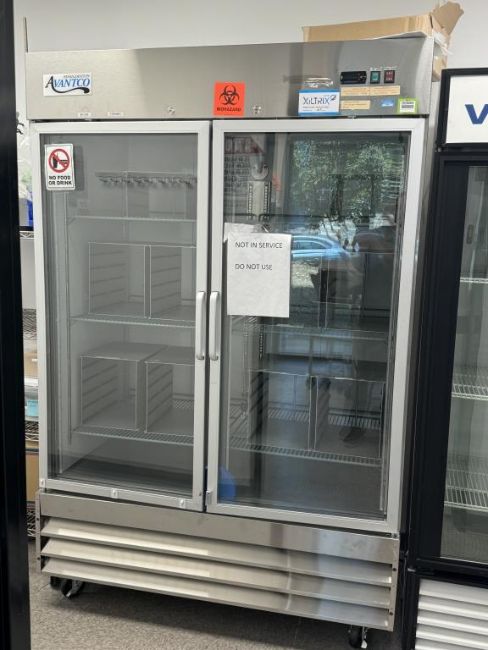 Avantco Refrigeration 178A49RGHC Double Glass-Door Stainless Steel Reach-In Refrigerator. S/N 7436 1713 2103 2701. HIT # 2526062. 124 Clean Room Growing Entrance.Asset Located at 9955 Mesa Rim Road, San Diego, CA 92121.
