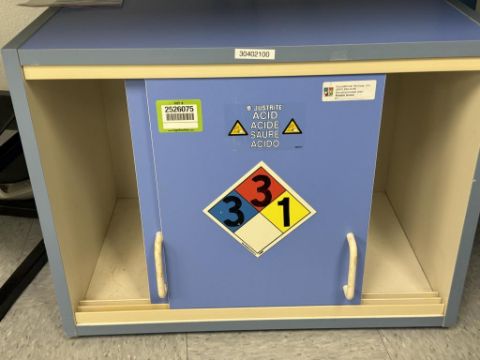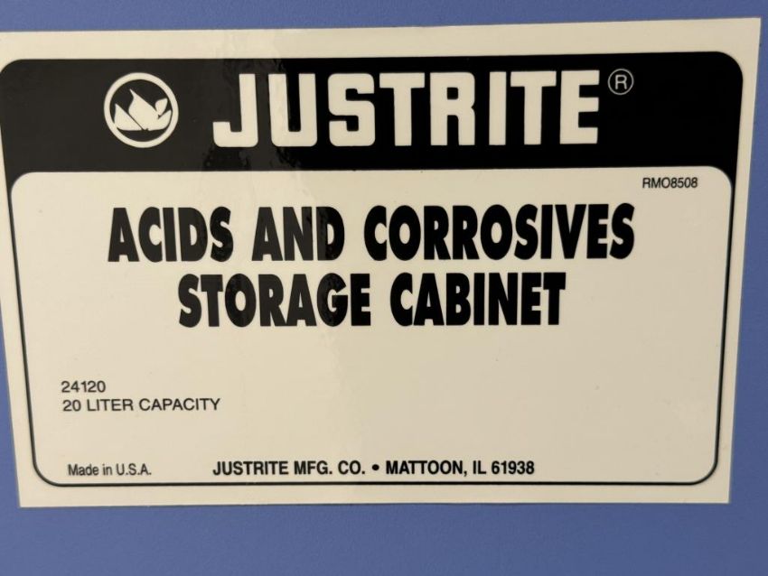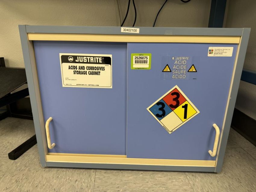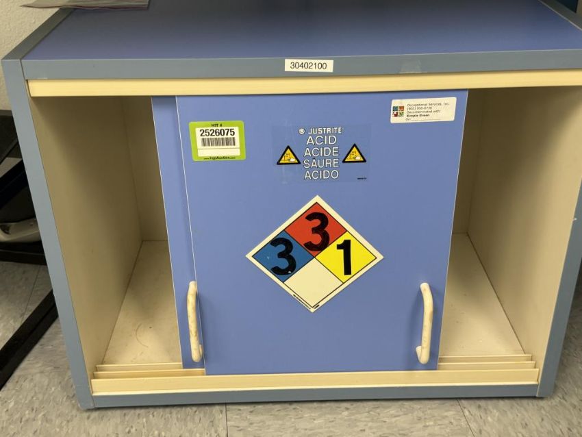Justrite 24120 20 Liter Capacity Acids & Corrosives Storage Cabinet. HIT # 2526075. Asset Located at 9955 Mesa Rim Road, San Diego, CA 92121.