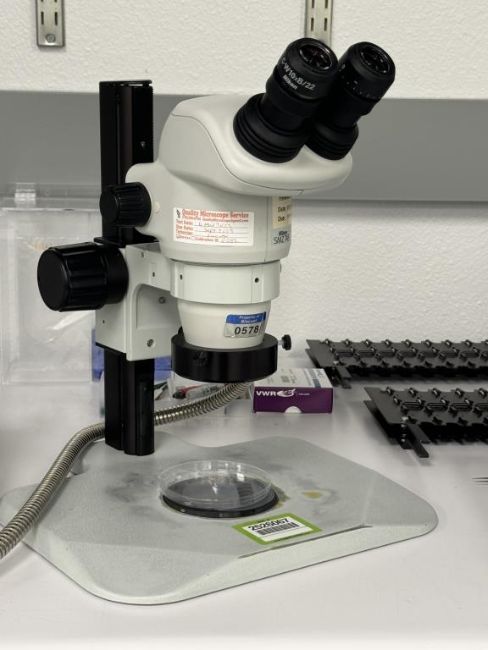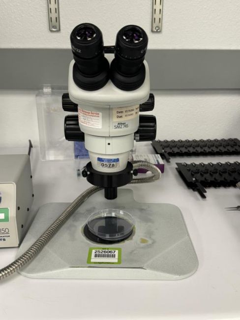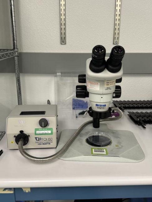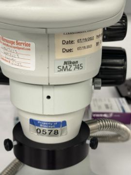 Nikon SMZ745 Stereo Microscope includes Techniquip FOI-150 Fiber Optic Illuminator. S/N 2546738, A39841. HIT # 2526067. Asset Located at 9955 Mesa Rim Road, San Diego, CA 92121.