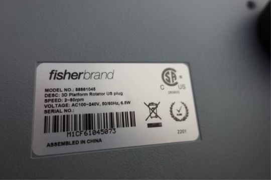 Fisherbrand 88861045 3D Platform Rotator with Power Adapter and Manual. S/N: M1CF61045073. HIT# 2481392. Loc: B2 - Warehouse Tables. Asset Located at 47448 Fremont Blvd., Fremont, CA 94538.