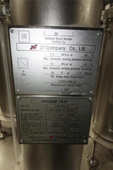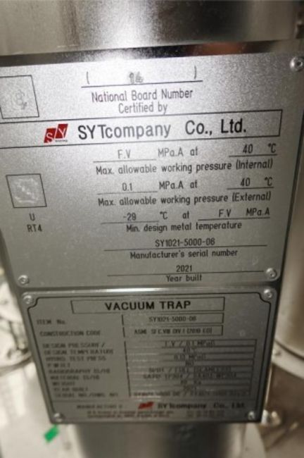 SY Tcompany Co. Ltd. Item # 1021-5000-02 (Lot of 3) Stainless Steel Vacuum Traps, Design Pressure: FV / 0.1 MPaG, Design Temperature40C, Hydro Test Pressure: 0.13 MPaG, Radiography (S/H) 5pot / Full (Seamless), Material: (S/H) SA312- TP304/ SA403-WP304, Weight 40 Kg, Year of Manufacture: 2021. HIT# 2357826. Loc: HANA E-Fill Room. Asset Located at 57 Hill Ave., Endicott, NY 13760.