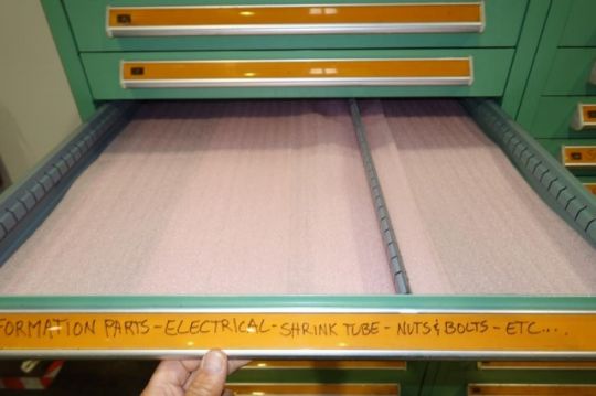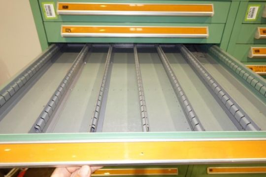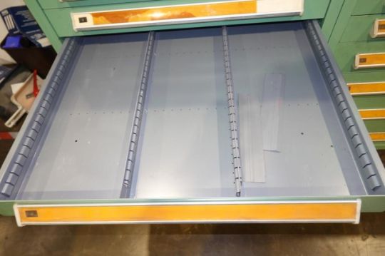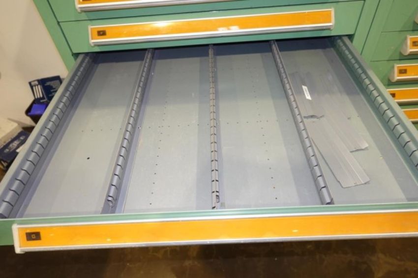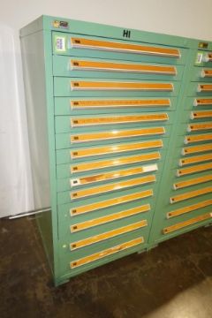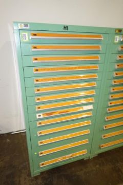 Stanley Vidmar 14-Drawer Parts Supply Cabinet. Dims: Approx. 30" w x 28" d x 59" in. Tall. HIT# 2357870. Loc: Formation Area. Asset Located at 57 Hill Ave., Endicott, NY 13760.