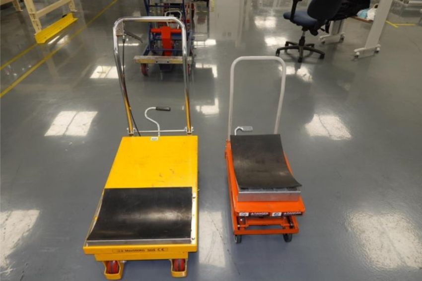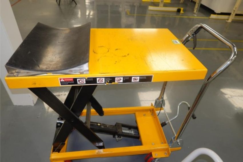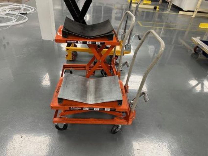(Lot of 3) Mobile Hydraulic Lift Tables With Foil Roll Holding Fixtures. 1000 lb., 264 lb., & 220 lb. Capacities. HIT# 2357844. Loc: HANA E-Fill Room Going To Clean Are Asset Located at 57 Hill Ave., Endicott, NY 13760.