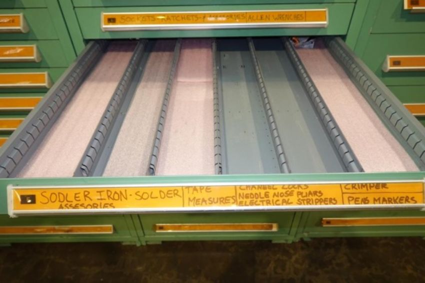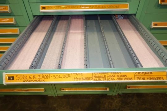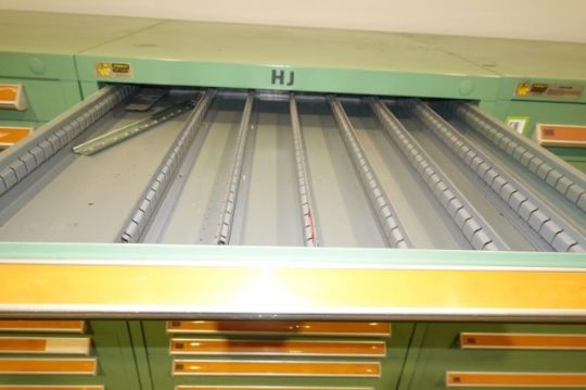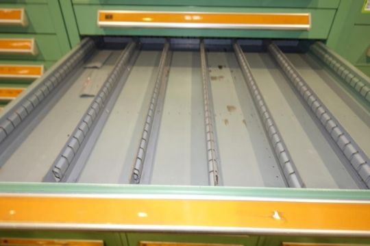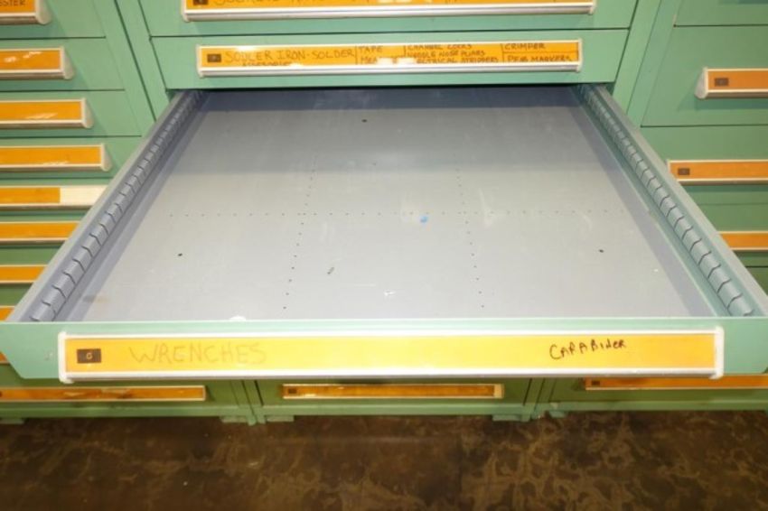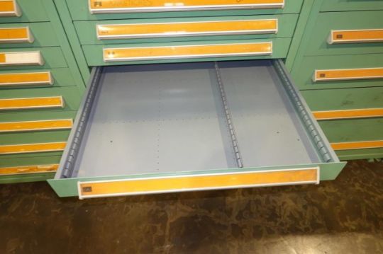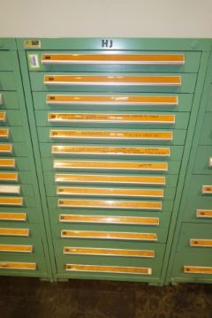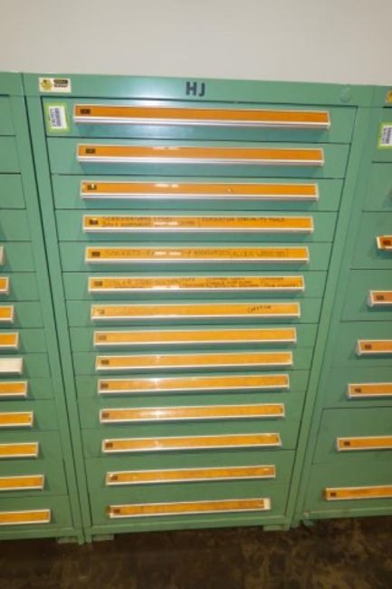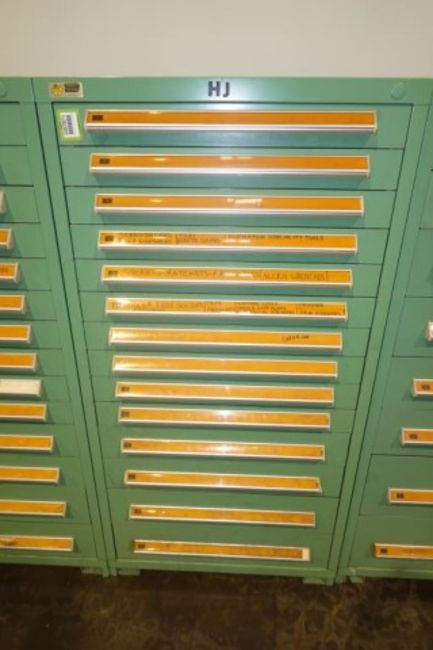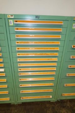 Stanley Vidmar 14-Drawer Parts Supply Cabinet. Dims: Approx. 30" w x 28" d x 59" in. Tall. HIT# 2357871. Loc: Formation Area. Asset Located at 57 Hill Ave., Endicott, NY 13760.