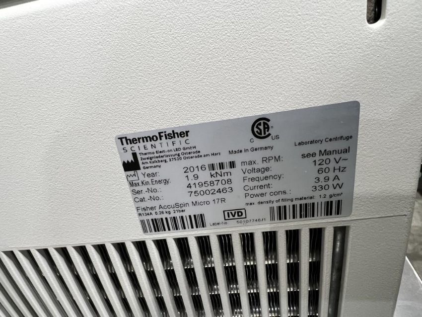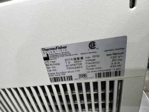 Fisher Scientific accuSpin Micro 17R Centrifuge. S/N: 41958708. Loc: Storage H2. HIT# 2571913. Loc: H2. Asset Located at 4909 Central Avenue, Richmond, CA 94804.