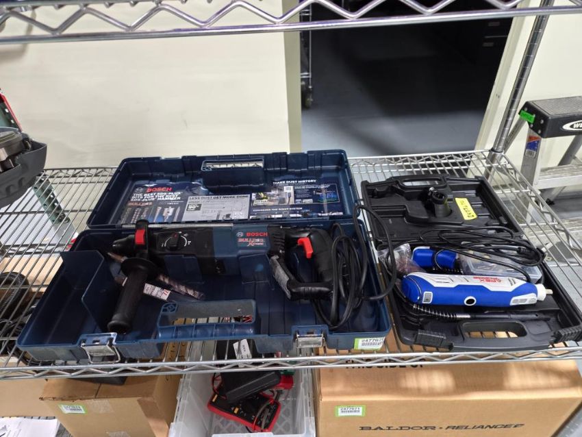 Bosch/Apex Forge Bulldog Xtreme Electric Hand Tools: Bulldog Xtreme Rotary Hammer Drill Kit; Apex Forge Rotary Tool Kit. HIT# 2477670. Unit 3 Back. Asset Located at 53 Brigham St. Unit 8, Marlborough, MA 01752. ***Auctioneer Notice*** Payment for this lot is due by no later than November 10, 2025. Removal of this lot is from November 17 - December 10, closed for Thanksgiving November 26-28. Lots not removed by close of business on December 12, 2025, will be deemed abandoned without refund or recourse.