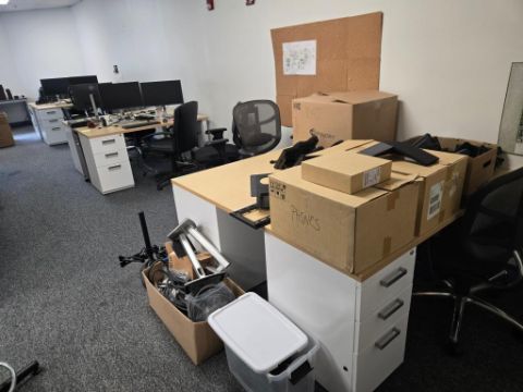 Office Furniture to Include: (6) Wood Top Desks, 54"x24" w/ Lower Cabinet (no contents); (7) Mesh Backed Adjustable Height Chairs w/ Casters; 2-Door Cabinets, 36"x72"x18" w/ Contents; (7) Leather Style Adjustable Height Chairs w/ Casters; (2) Wood Top Tables, 66"x20" w/ Casters (no contents); Marker Board; Insignia 65" Flat Screen HD TV w/ Remote & Wall Mount; Logitech Camera/Speaker System (no contents). HIT# 2477768. Unit 2 Office. Asset Located at 53 Brigham St. Unit 8, Marlborough, MA 01752. ***Auctioneer Notice*** Payment for this lot is due by no later than November 10, 2025. Removal of this lot is from November 17 - December 10, closed for Thanksgiving November 26-28. Lots not removed by close of business on December 12, 2025, will be deemed abandoned without refund or recourse.