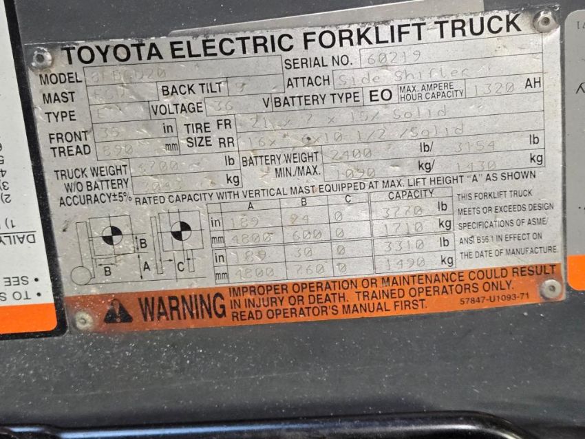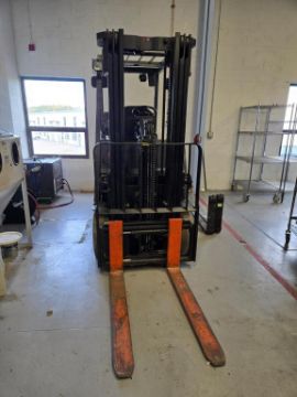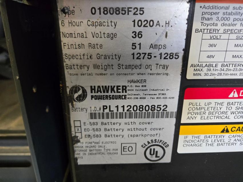 Toyota 8F-BCU20 36V Electric Fork Lift, Capacity 3770lb., Mast Height 189", Joystick Controls, Side/Tilt/Up-Down Shift. Truck Weight w/ Battery 9100lb. (not in working order). SN# 60219. HIT# 2477627. Unit 1 Front/Orange. Asset Located at 53 Brigham St. Unit 8, Marlborough, MA 01752. ***Auctioneer Notice*** Payment for this lot is due by no later than November 10, 2025. Removal of this lot is from November 17 - December 10, closed for Thanksgiving November 26-28. Lots not removed by close of business on December 12, 2025, will be deemed abandoned without refund or recourse.