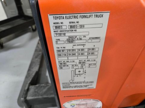 Toyota 8BWS13 Walk Behind 24V Electric Lift Truck. Capacity 2500lb @ 104"/2000lb @ 128". SN# 8BWS13-12819. HIT# 2477606. Unit 2 Back. Asset Located at 53 Brigham St. Unit 8, Marlborough, MA 01752. ***Auctioneer Notice*** Payment for this lot is due by no later than November 10, 2025. Removal of this lot is from November 17 - December 10, closed for Thanksgiving November 26-28. Lots not removed by close of business on December 12, 2025, will be deemed abandoned without refund or recourse.