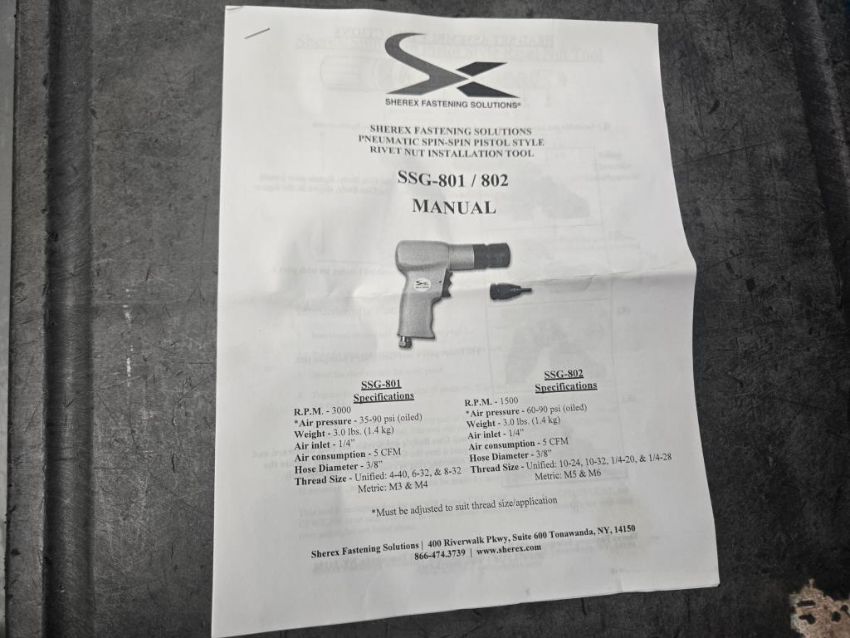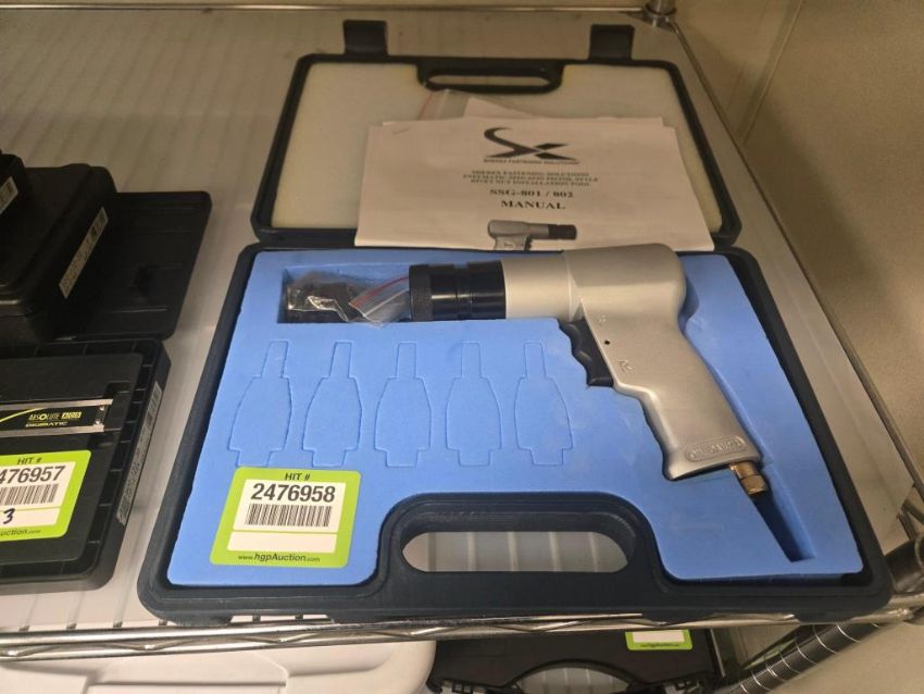 Sherex Fastening SSG-802 Pneumatic Spin-Spin Pistol Style Rivet Nut Installation Tool Kit. HIT# 2476958. Unit 3 Inspection Room. Asset Located at 53 Brigham St. Unit 8, Marlborough, MA 01752. ***Auctioneer Notice*** Payment for this lot is due by no later than November 10, 2025. Removal of this lot is from November 17 - December 10, closed for Thanksgiving November 26-28. Lots not removed by close of business on December 12, 2025, will be deemed abandoned without refund or recourse.
