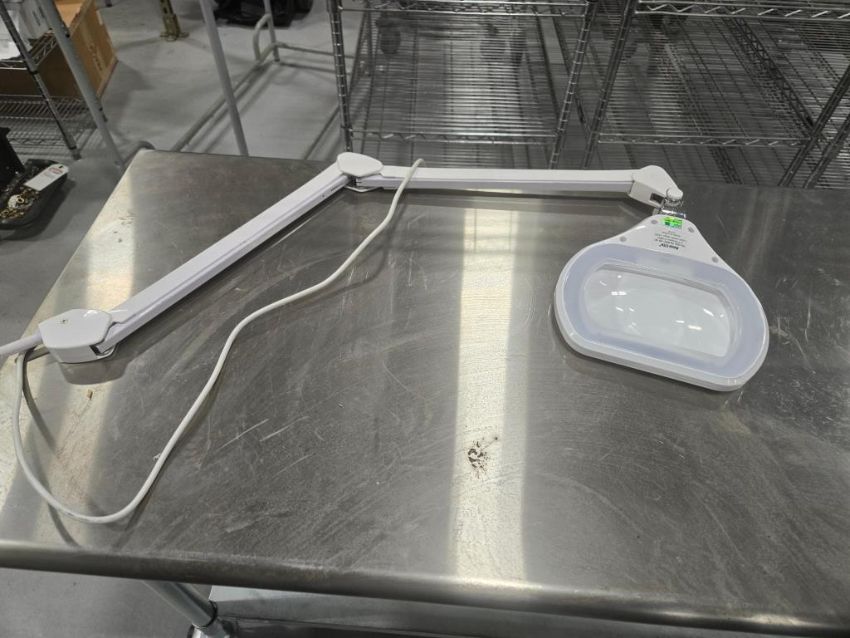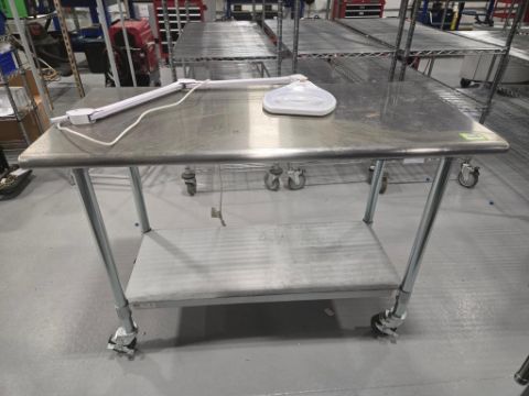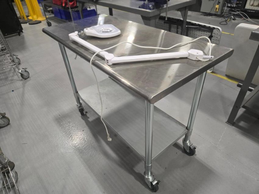 Uline H-9645 Portable SS 2-Teir Table, 48"x24" w/ Acculite Magnifier Light. HIT# 2477728. Unit 1 Back. Asset Located at 53 Brigham St. Unit 8, Marlborough, MA 01752. ***Auctioneer Notice*** Payment for this lot is due by no later than November 10, 2025. Removal of this lot is from November 17 - December 10, closed for Thanksgiving November 26-28. Lots not removed by close of business on December 12, 2025, will be deemed abandoned without refund or recourse.