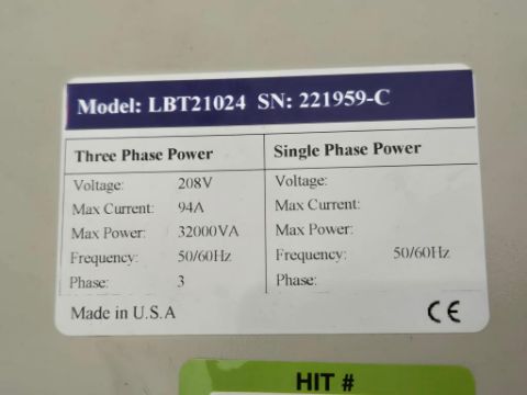 Arbin LBT21024 Battery Tester. Electric 208V, 3PH, 94A, 50/60Hz. Power 32000VA w/ Casters. *Sale is Subject to Seller Confirmation with Bulk Sale Lot 802A.* SN# 221959-C. HIT# 2477232. Unit 7 Left. Asset Located at 53 Brigham St. Unit 8, Marlborough, MA 01752. ***Auctioneer Notice*** Payment for this lot is due by no later than November 10, 2025. Removal of this lot is from November 17 - December 10, closed for Thanksgiving November 26-28. Lots not removed by close of business on December 12, 2025, will be deemed abandoned without refund or recourse.