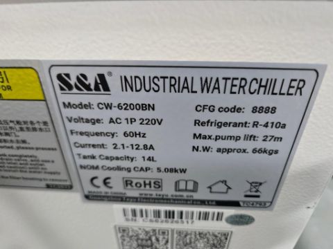MTI CW-6200BN Portable Digital Recirculating Water Chiller, Electric 220V, 1PH, 2.1-11.8A, 60Hz, Pump Lift Max 27M. Power 5.08kW. Refrigerant R410A. SN# CS62626517. HIT# 2477035. Unit 3 Back. Asset Located at 53 Brigham St. Unit 8, Marlborough, MA 01752. ***Auctioneer Notice*** Payment for this lot is due by no later than November 10, 2025. Removal of this lot is from November 17 - December 10, closed for Thanksgiving November 26-28. Lots not removed by close of business on December 12, 2025, will be deemed abandoned without refund or recourse.