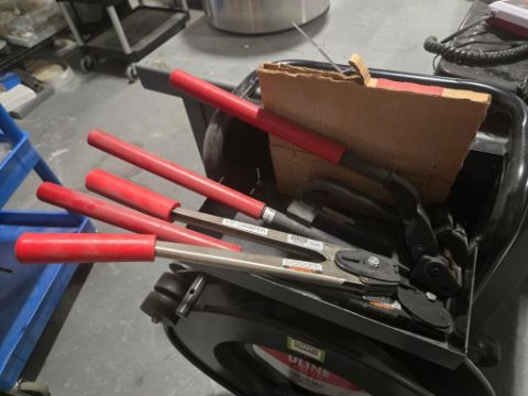 Uline/Rubbermaid Banding Cart w/ Banding Tools & Shipping Scale. HIT# 2477735. Unit 6 Back. Asset Located at 53 Brigham St. Unit 8, Marlborough, MA 01752. ***Auctioneer Notice*** Payment for this lot is due by no later than November 10, 2025. Removal of this lot is from November 17 - December 10, closed for Thanksgiving November 26-28. Lots not removed by close of business on December 12, 2025, will be deemed abandoned without refund or recourse.
