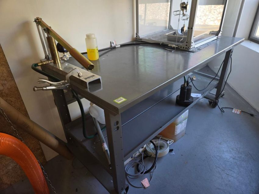 Portable Steel 2-Tier Work Table, 72"x36". Includes: Enclosure; Richard Dudgeon Hydrostatic Test Pump; Simer Submersible Utility Pump. HIT# 2477741. Unit 2 Front. Asset Located at 53 Brigham St. Unit 8, Marlborough, MA 01752. ***Auctioneer Notice*** Payment for this lot is due by no later than November 10, 2025. Removal of this lot is from November 17 - December 10, closed for Thanksgiving November 26-28. Lots not removed by close of business on December 12, 2025, will be deemed abandoned without refund or recourse.