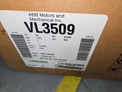 Baldor-Reliance VL3509 Motor, 1hp, 115/230V, 1PH, 60Hz, 3450rpm (new in box). SN# F2204133171. HIT# 2477671. Unit 3 Back. Asset Located at 53 Brigham St. Unit 8, Marlborough, MA 01752. ***Auctioneer Notice*** Payment for this lot is due by no later than November 10, 2025. Removal of this lot is from November 17 - December 10, closed for Thanksgiving November 26-28. Lots not removed by close of business on December 12, 2025, will be deemed abandoned without refund or recourse.