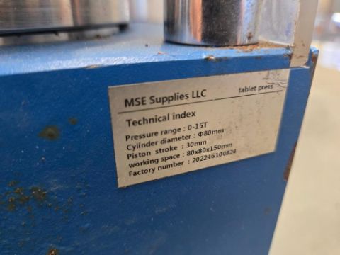 MSE Tablet Press, Pressure Range 0-15T, Piston Stroke 30mm. HIT# 2477203. Unit 1 Front. Asset Located at 53 Brigham St. Unit 8, Marlborough, MA 01752. ***Auctioneer Notice*** Payment for this lot is due by no later than November 10, 2025. Removal of this lot is from November 17 - December 10, closed for Thanksgiving November 26-28. Lots not removed by close of business on December 12, 2025, will be deemed abandoned without refund or recourse.