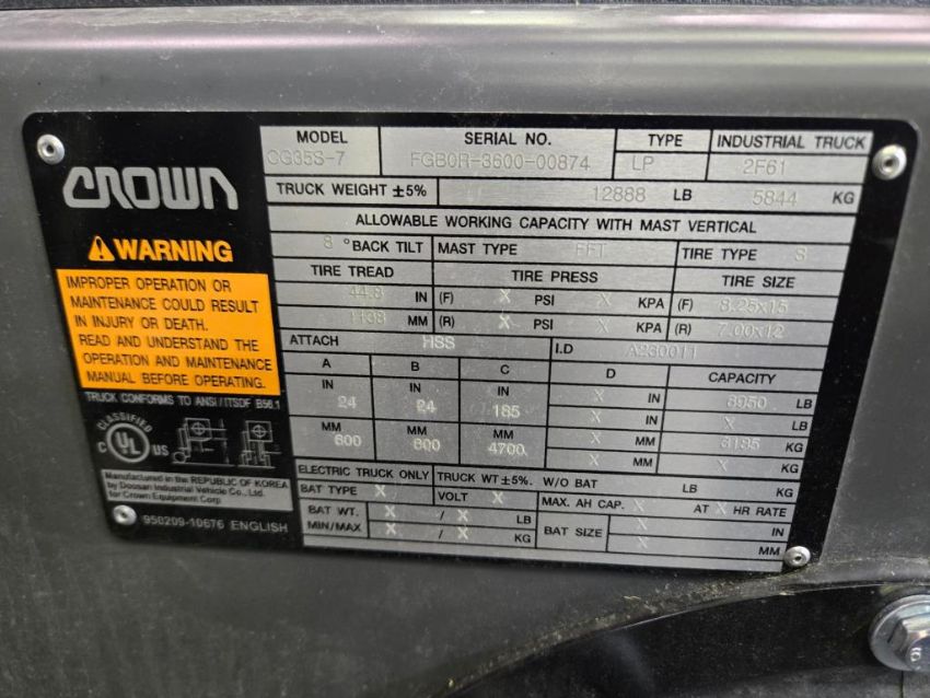Crown CG35S-7 LP Fork Lift, Capacity 6950lb, Side/Tilt/Up-Down Shifting, Mast height 185", Pneumatic Indoor/Outdoor Tires, Safety Cage, Digital Display, Truck Weight 12888lb. SN#FGBOR-3600-00874. HIT# 2477577. Unit 4. Asset Located at 53 Brigham St. Unit 8, Marlborough, MA 01752. ***Auctioneer Notice*** Payment for this lot is due by no later than November 10, 2025. Removal of this lot is from November 17 - December 10, closed for Thanksgiving November 26-28. Lots not removed by close of business on December 12, 2025, will be deemed abandoned without refund or recourse.