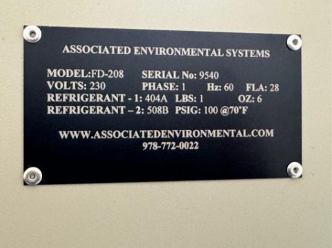 Associated Environmental FD-208 Environmental Chamber. Electrical: 230V, 60Hz, 28 Amps, 1 PH. Refrigerant: 404a, 1lb. / R5008b 100 PSIG @ 70F Product Code: 389776. SN# 9540. HIT# 2320256. Asset Located at 2010 Diamond Hill Rd., Woonsocket, RI 02895. ***Auctioneer Notice*** Payment for this lot is due by no later than November 10, 2025. Removal of this lot is from November 17 - December 10, closed for Thanksgiving November 26-28. Lots not removed by close of business on December 12, 2025, will be deemed abandoned without refund or recourse.