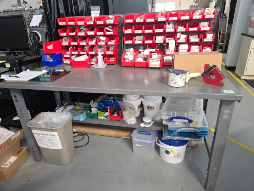 Adjustable Height Metal Work Bench w/ Contents, 72"x36" (see pictures for details). HIT# 2476888. Unit 8 Front. Asset Located at 53 Brigham St. Unit 8, Marlborough, MA 01752. ***Auctioneer Notice*** Payment for this lot is due by no later than November 10, 2025. Removal of this lot is from November 17 - December 10, closed for Thanksgiving November 26-28. Lots not removed by close of business on December 12, 2025, will be deemed abandoned without refund or recourse.