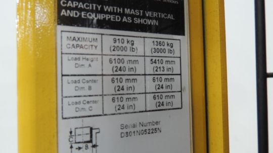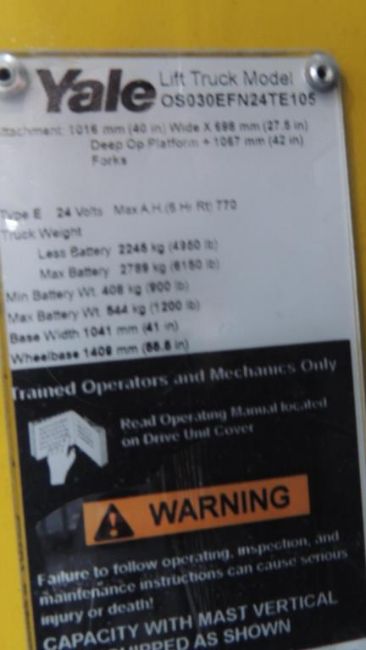 Yale Model OS030EFN24TE105 Yale Model OS030EFN24TE105 Stand up 24V electric order picker, 240 in. vertical mast, max. capacity 3000 lb. @ 213in. See Photos for More Information. SN# D801N05225N. HIT# 2509889. Production Area. Asset Located at 2121 Providence Drive Ste. 151, Fort Worth, TX 76106. SN# D801N05225N. HIT# 2509889. Production Area. Asset Located at 2121 Providence Drive Ste. 151, Fort Worth, TX 76106.