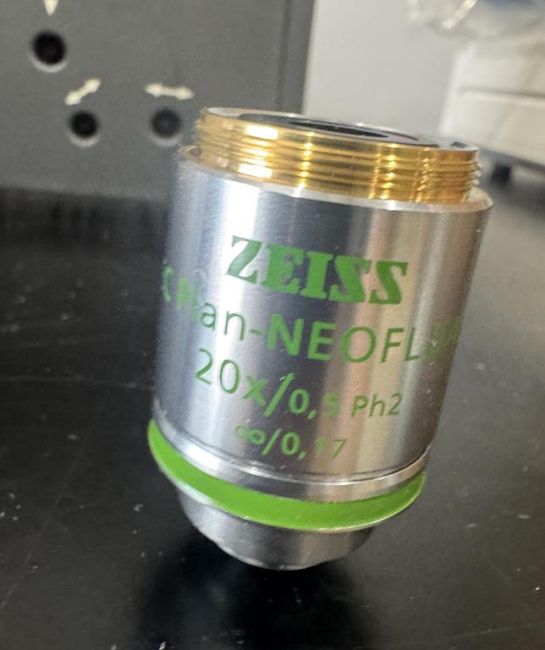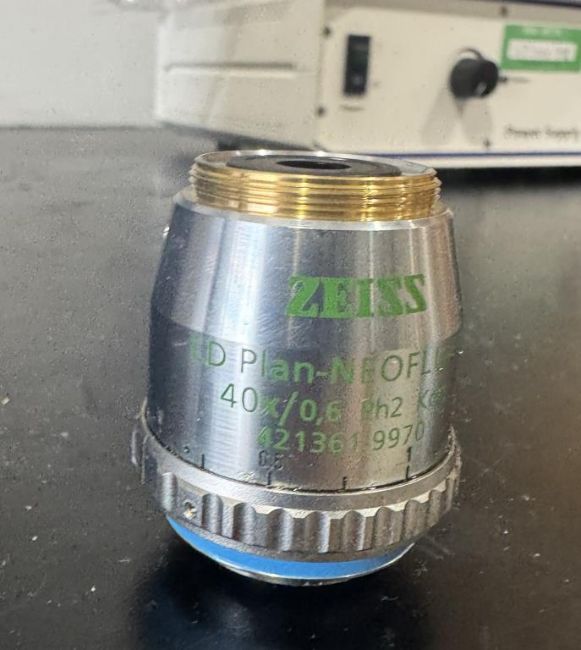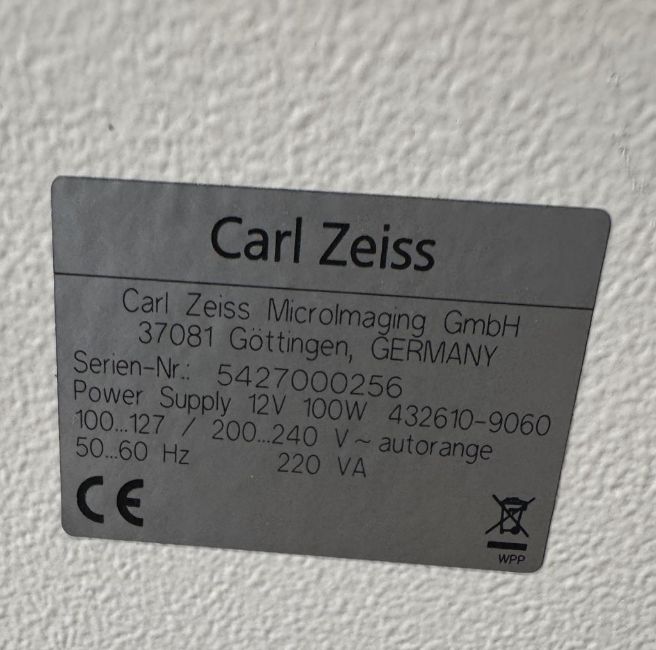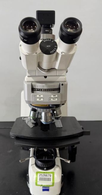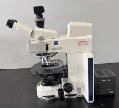 Zeiss AXIO Scope.A1 Microscope includes Power Supply, Camera, HAL 100 Light Source, and (3) Objectives. (1) 20x, (1) 40x, (1) 100x. S/N 3325000121, 3338000230, 5427000256. HIT # 2526679. Asset Located at 9687 Distribution Ave., San Diego, CA 92121.