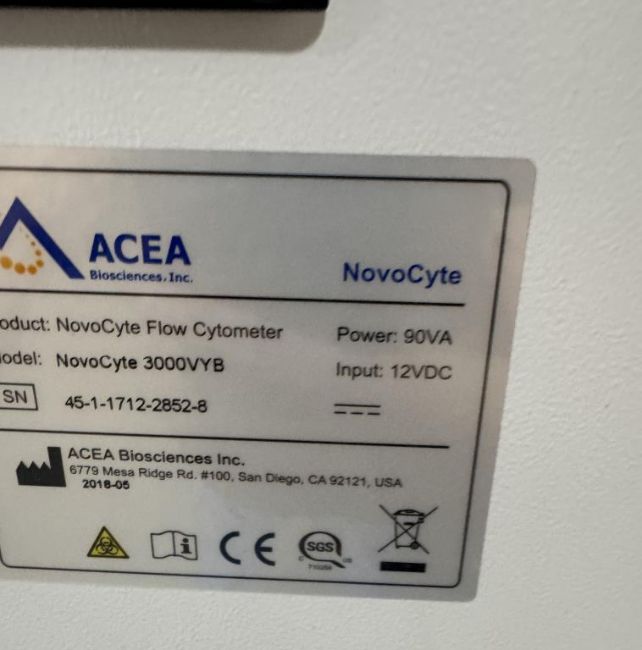 ACEA Biosciences NovoCyte 3000VYB Flow Cytometer with NS200 NovoSample Pro (missing power supply and fluidics station. S/N 45-1-1712-2852-8, 48-1-1801-1266-8. HIT # 2526670. Asset Located at 9687 Distribution Ave., San Diego, CA 92121.