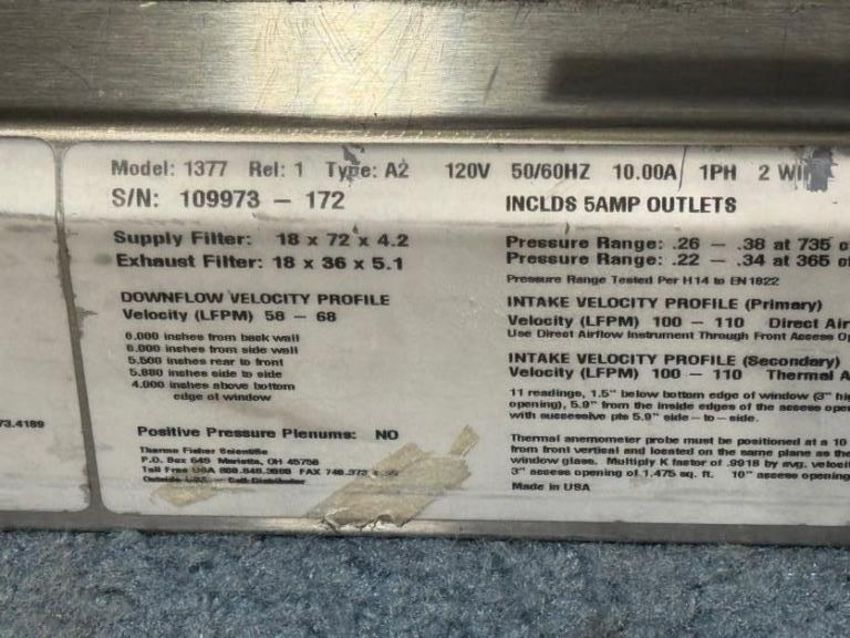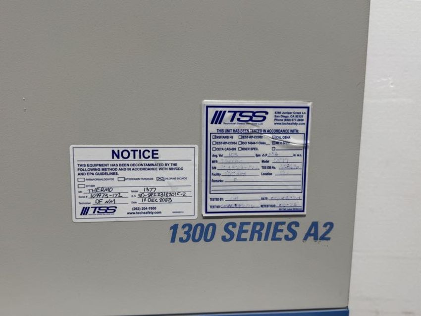 Thermo Fisher Scientific 1377 6ft. 1300 Series Type A2 Biological Safety Cabinet with Stand. S/N 109973-172. HIT # 2526614. Asset Located at 9687 Distribution Ave., San Diego, CA 92121.