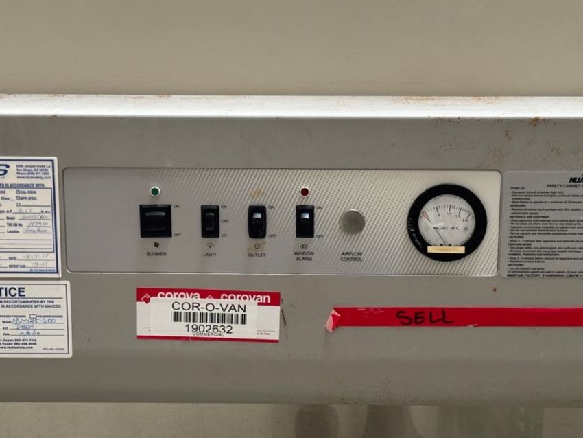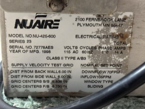 NuAire NU-425-600 6ft. Class II Type A-B3 Biological Safety Cabinet with Stand. S/N 72778AES. HIT # 2526613. Asset Located at 9687 Distribution Ave., San Diego, CA 92121.