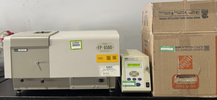 Jasco FP-6500 Spectrofluorometer includes EHC-573T Temperature Controller and accessories. S/N D090260822, A008760897. HIT # 2526691. Asset Located at 9687 Distribution Ave., San Diego, CA 92121.