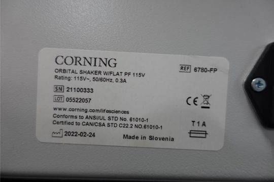 Corning Orbital Shaker, 115v, 60 Hz, 0.3 AMPS, Speed: 3-60 RPM. SN# 21100333. Asset# 230572. HIT# 2516110. Asset Located at 112 S Duke St. STE 1B, Durham, NC 27701.